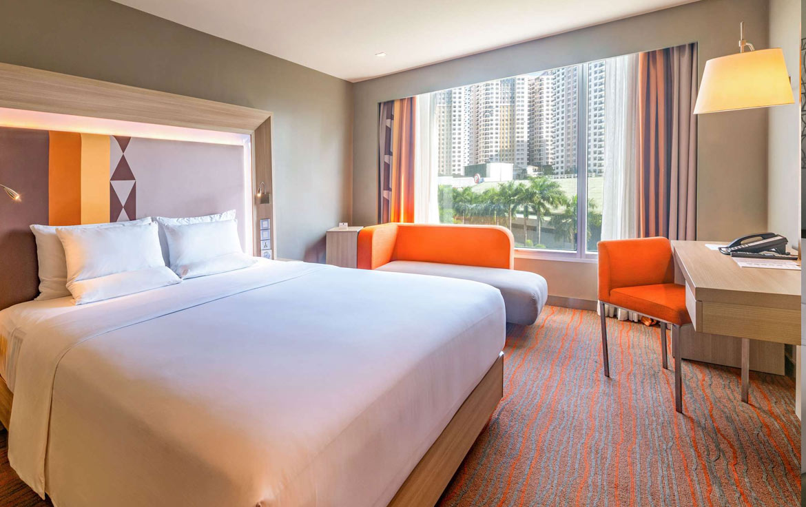 Discover modern comfort in its 401 stylish rooms and suites, experience contemporary casual dining at Food Exchange Manila, and enjoy a drink at the hip Gourmet Bar by Novotel before heading to the trendy Pool and Lounge Bar, Premier Lounge, outdoor Bridal Garden, pillarless Grand Ballroom and 7 spacious meeting rooms.